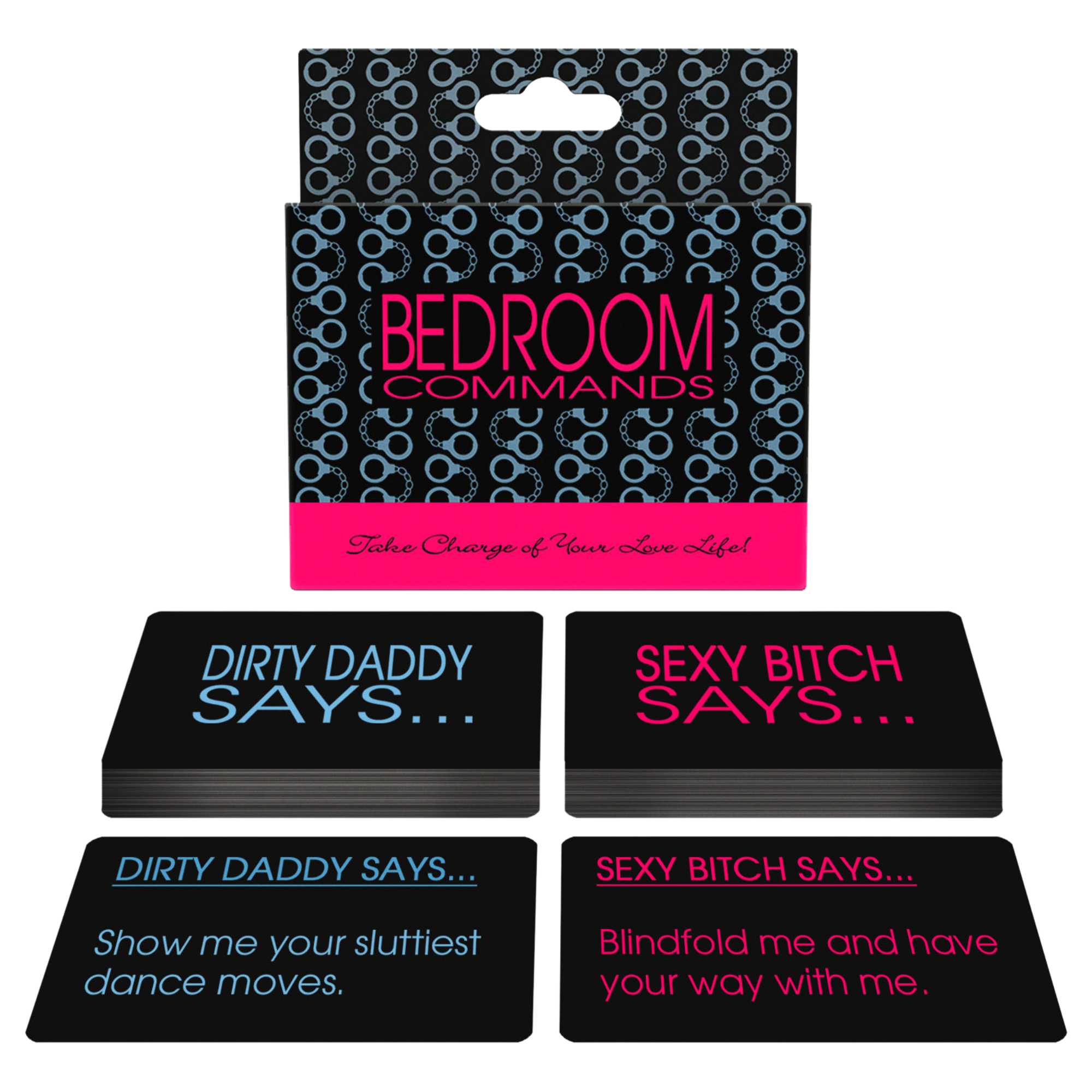 Bedroom Commands is a double deck card game of commands. One deck is for the Dirty Daddy and the other is for the Sexy Bitch. Whenever either of you feels like taking charge of your love life. select a card to reveal an action for the evening. Some cards are funny. fun. and sexy. Other cards offer unique sex suggestions for bringing some variety into your relationship.
