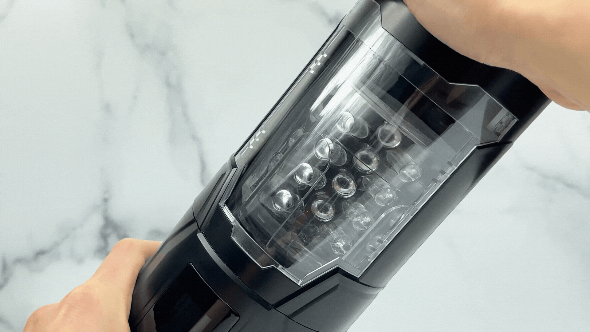 • The clear viewing window and 360 degree rotating inner sleeve offers an enticing visual element. letting you watch each deep. rhythmic thrust in action. With 7 rotating modes to choose from. you are sure to cum harder than before with every twist and thrust!