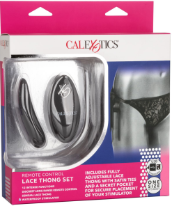 Indulge in your newest naughty little secret with the Remote Control Lace Thong! This sexy set includes a stretchy tie-on lace thong. a curved panty vibrator. and a discreet remote control that you can use alone or with a partner! The sexy lace panties feature an internal pocket to keep the slim bullet vibe in place. so you can enjoy powerful vibrations that will have you squirming with pleasure! Hand the remote to your partner to let them tease you with the 12 vibration functions. The pocket-sized remote works up to a 32-foot radius so your lover can control the thrilling vibes from across the room. even in public! The velvety-smooth silicone vibrator is a great size for holding against your clit during intercourse for added external stimulation to help you reach orgasm faster! The panty vibe is completely waterproof. making it so easy to clean. and the thong is even machine washable so you this sensual set of vibrating panties will be ready to go whenever and wherever your passion takes you!