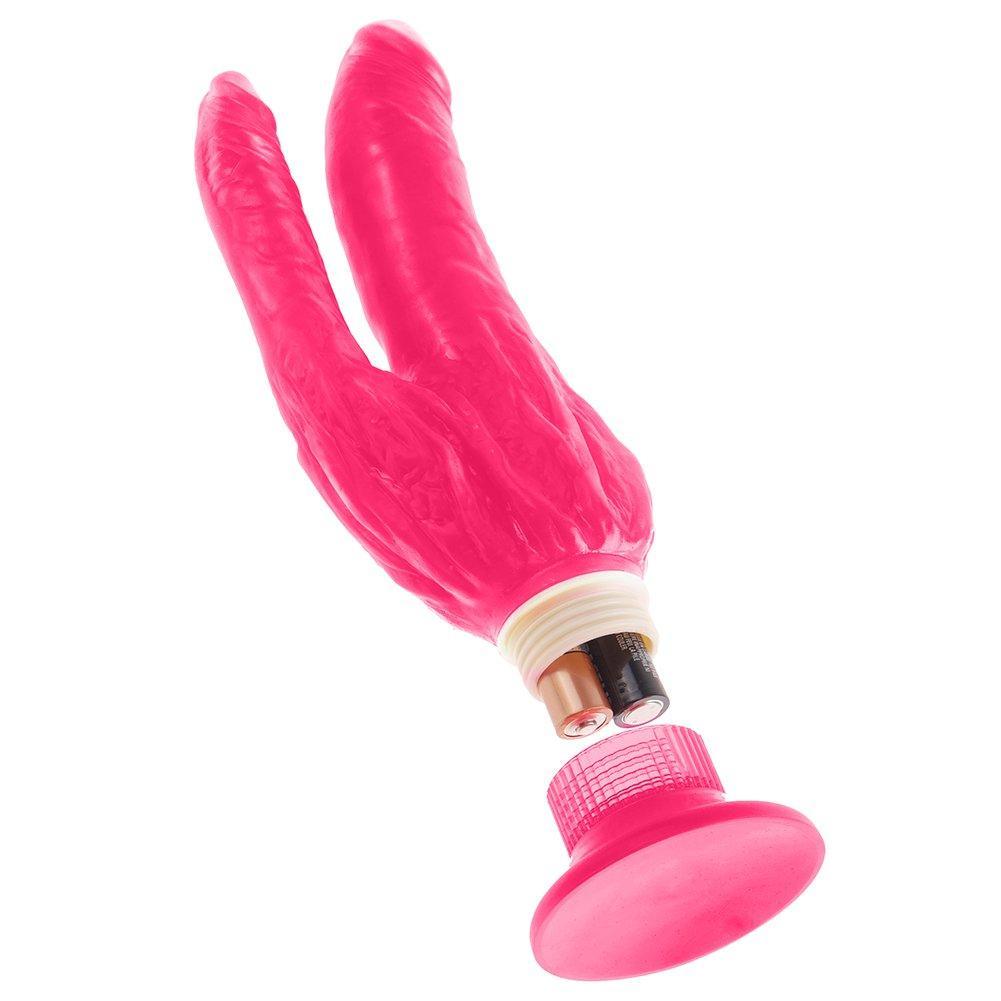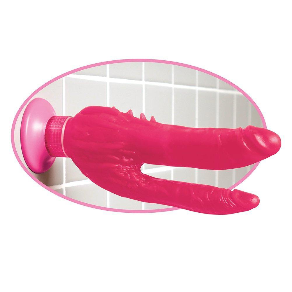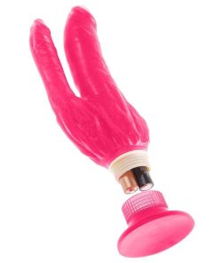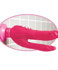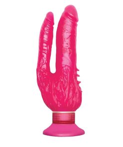 Double your pleasure with this double penetration vibrator! This soft. flexible jelly sex toy is attached to a powerful suction cup for DP thrills in the bath. shower. or any flat surface you can imagine! Both shafts feature realistic penis heads and raised vein texture for sensational thrills. Raised nubs along the base of the larger shaft offer clitoral teasing with each thrust. Twist the base to turn on and enjoy stimulating powerful vibrations along the main shaft. Firm suction cup adheres to any flat. non-porous surface.