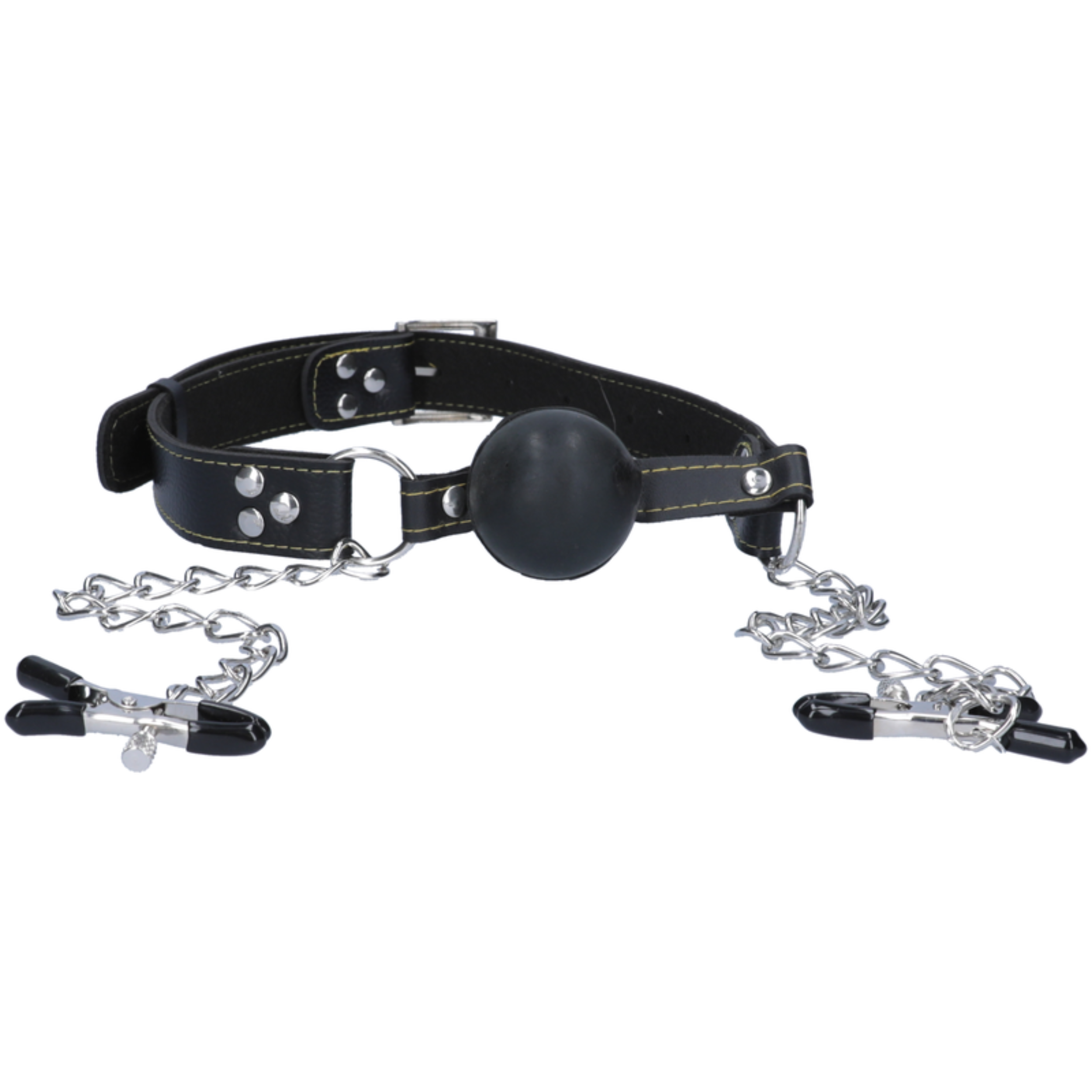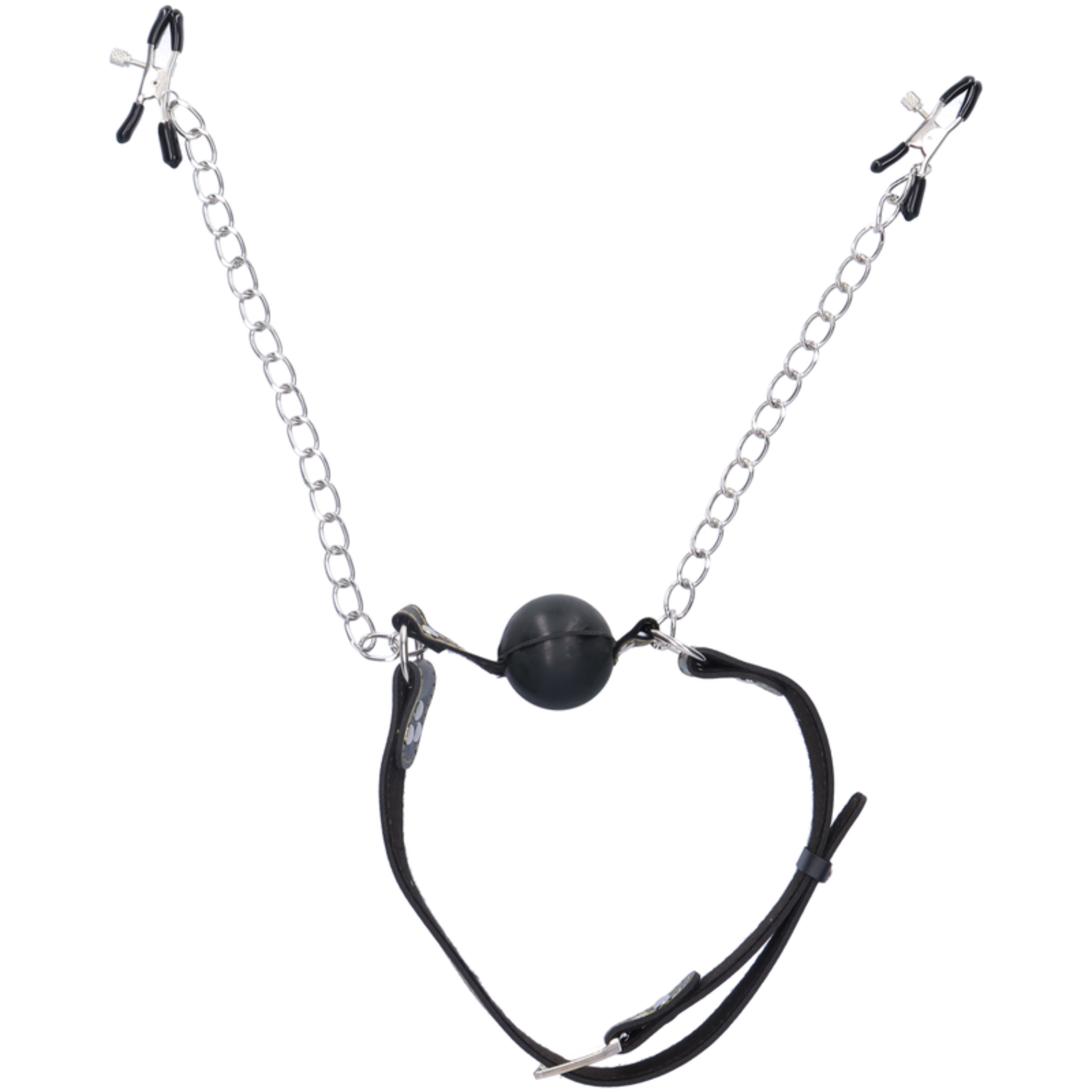 Tease and silence your subject with this naughty Deluxe Ball Gag & Nipple Clamps. The gag consists of a 1 3/4 wide rubber ball. connected to a sturdy leather strap that adjusts to fit most sizes. The two chained nipple clamps are made with durable metal clips and covered in soft rubber liners. making them perfect for beginners and fetish enthusiasts alike.