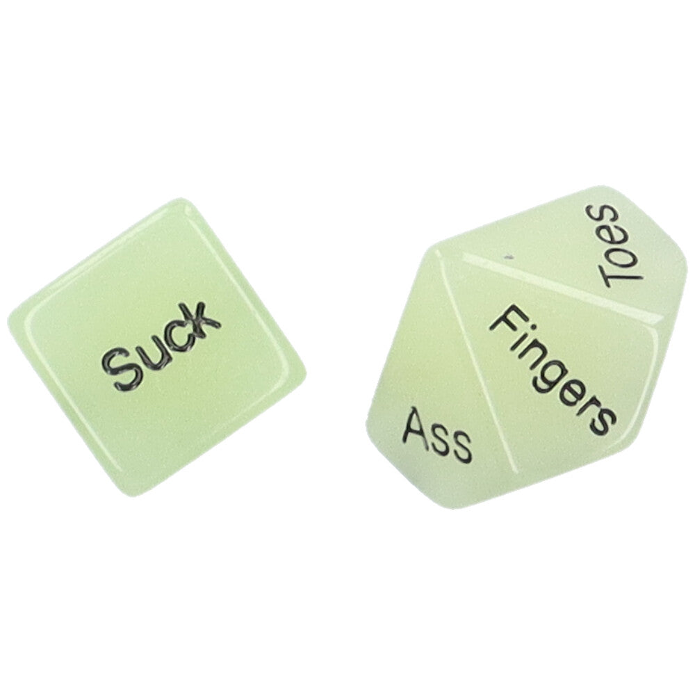 - Kinky glow-in-the-dark sex dice game that includes 2 dice with various sexual acts and body parts to incorporate into your play.