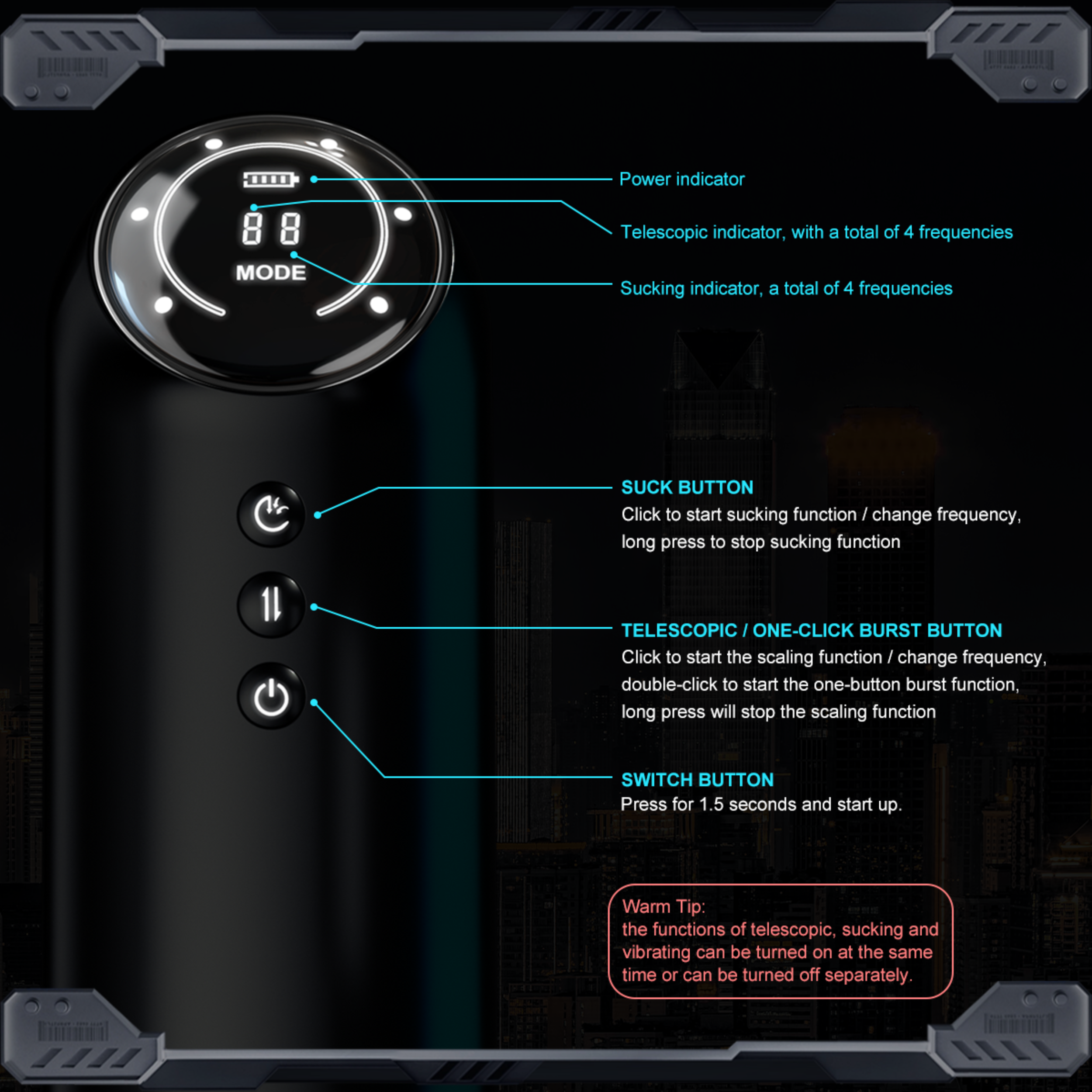 How do I use this masturbator? To turn this machine on. press and hold the power button. The masturbator will vibrate and light up. but no functions will start. Attach the provided headphones to hear the moaning function. A quick press of the power button with cycle through the vibration settings. Press the middle button to cycle through the 4 thrusting functions. The top button will control the 4 sucking sensations with a quick press.