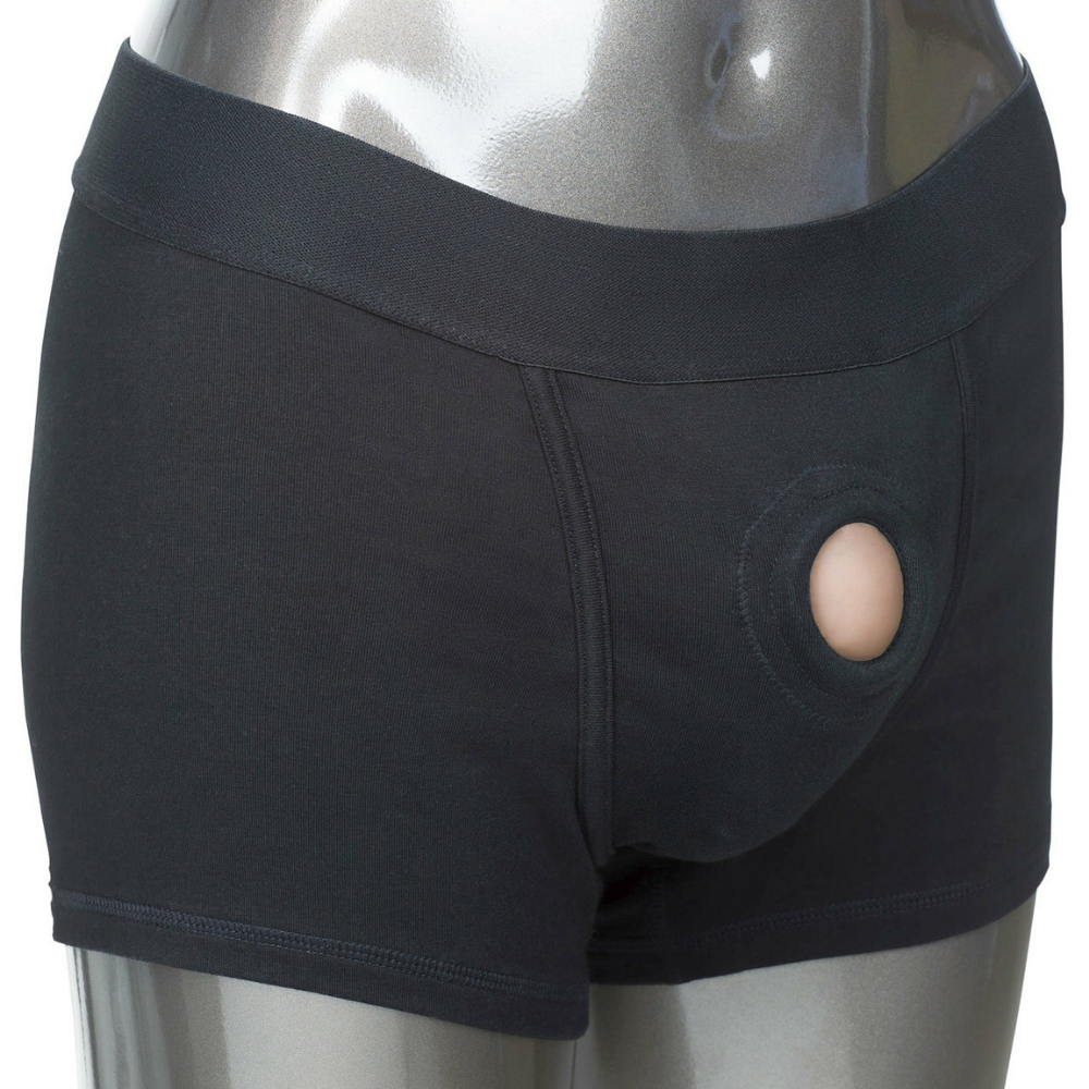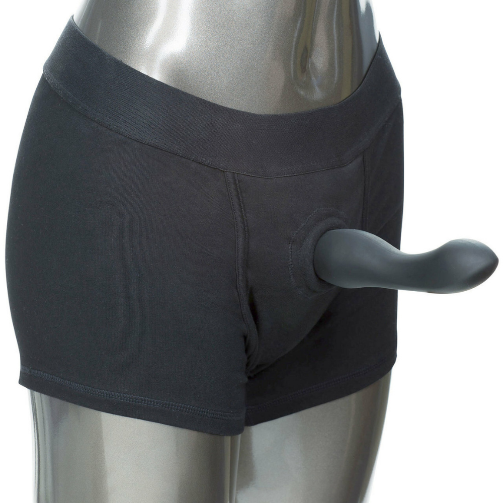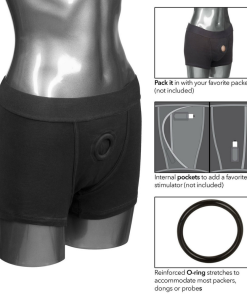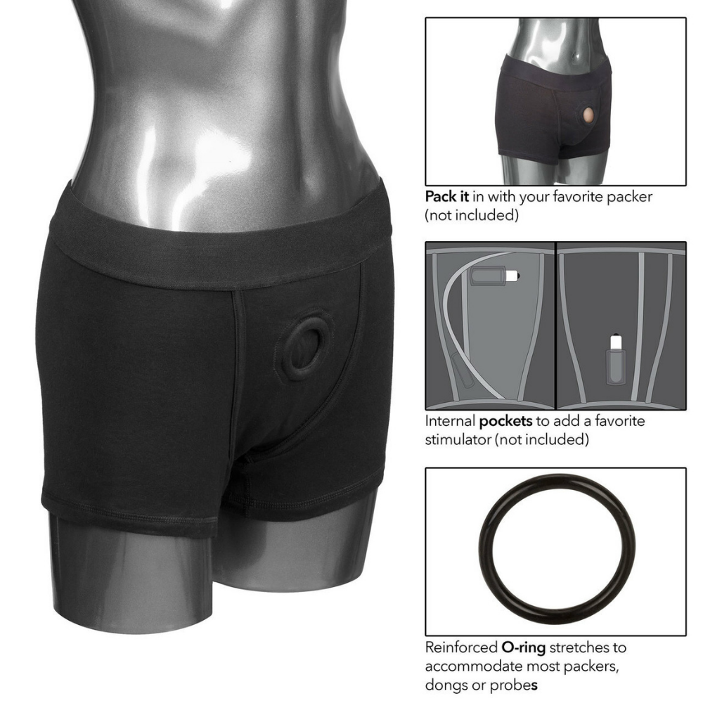 Insert your own dildo. packer. or probe into the dual-panel front pouch. These classic boxer briefs slip on just like a regular pair of boxers and easily support a strap-on attachment so you can enjoy hands-free penetration and increase intimacy with your partner! Add a small vibrator to the internal pockets for even more incredible stimulation for both you and your partner during sex.