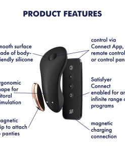 Attach the vibrator to panties with the magnetic clip. Vibrations can be controlled directly on the toy. with the wireless remote. or with the Satisfyer Connect App. Ideal for discreet pleasure directly on the clitoris.