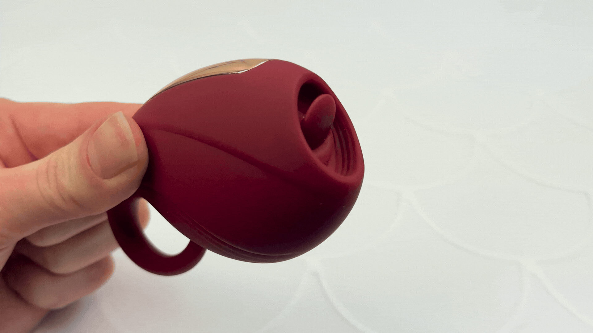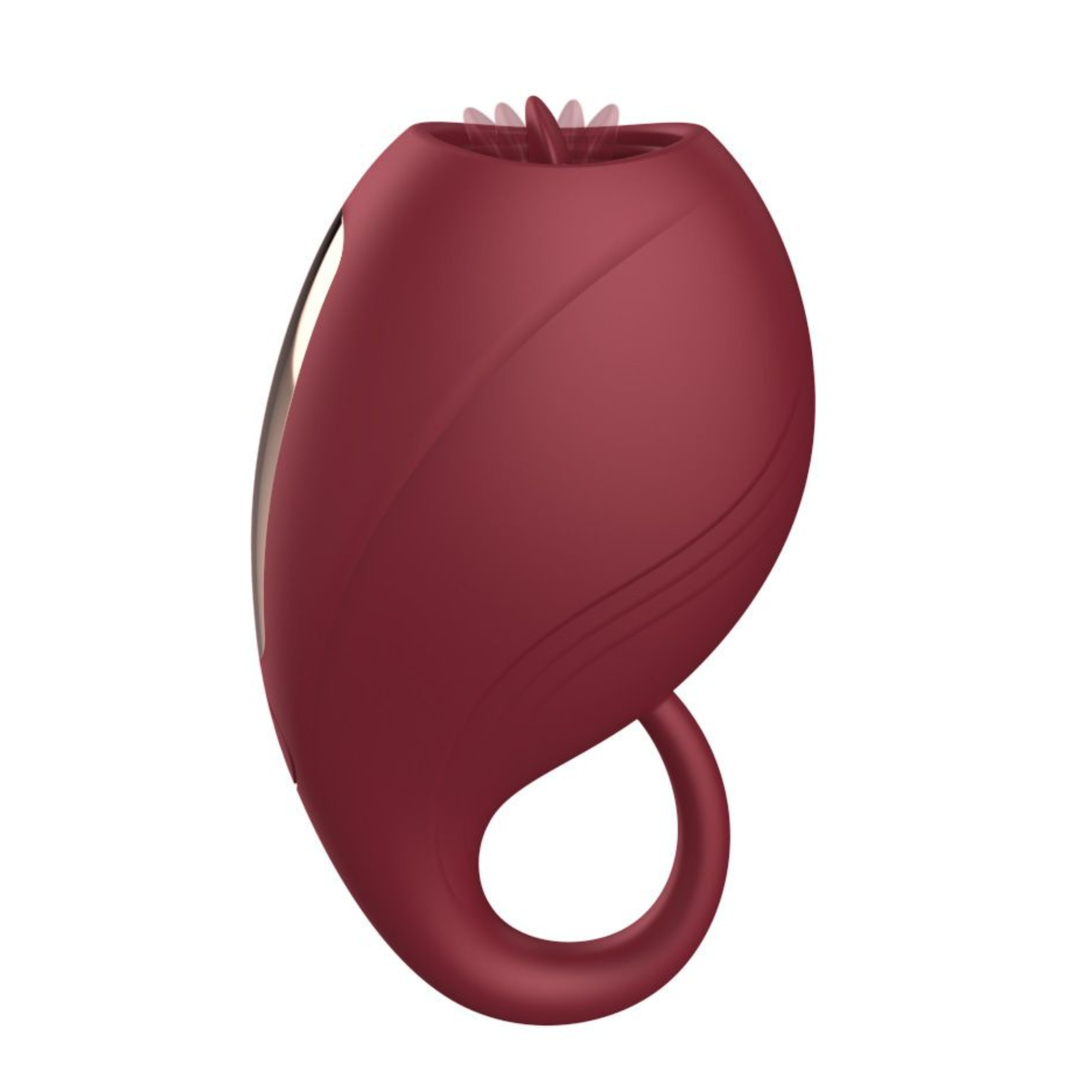 • This compact. palm-sized clit licker is designed for ultimate pleasure on the go. With its ergonomic shape and sleek. curved body. it fits comfortably in your hand. while the flexible finger loop provides a secure grip for precise control.