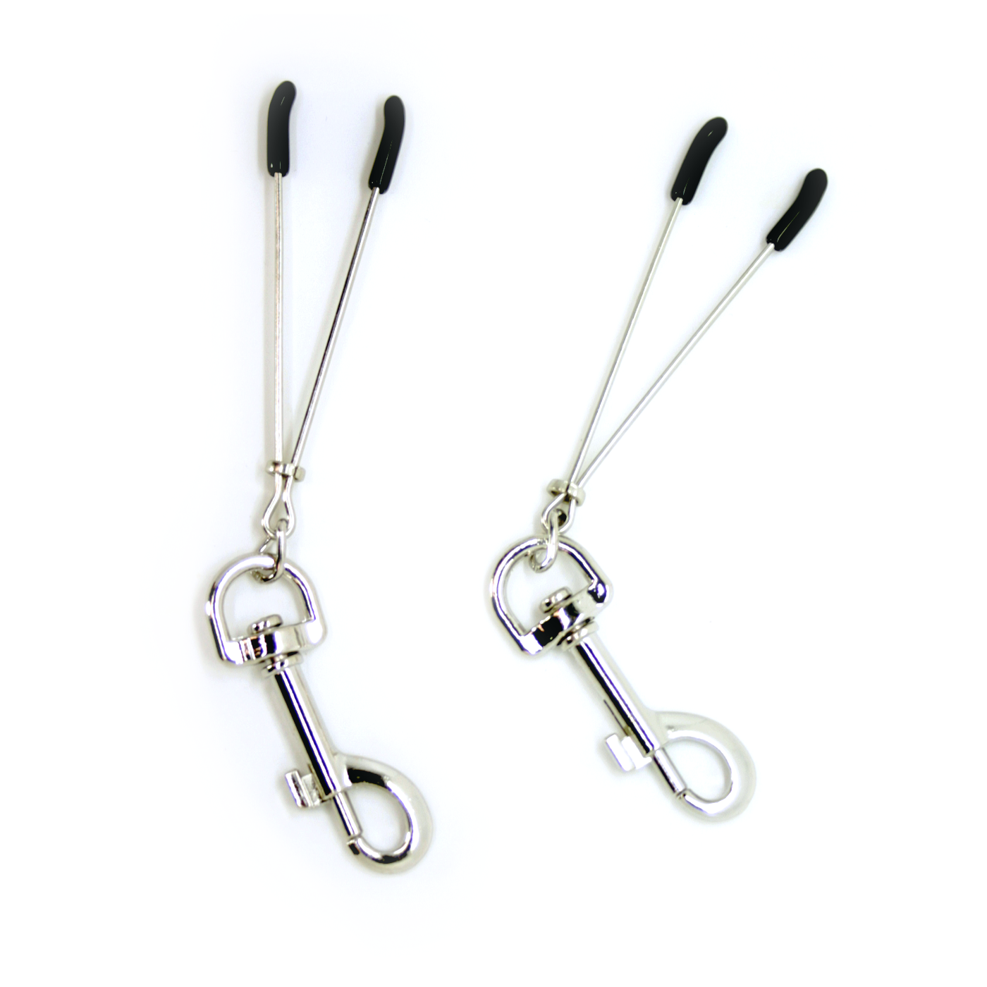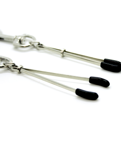 Enhance your next sensual foreplay experience with these tweezer style nipple clamps! Use the easily adjustable metal ring to adjust the pressure until you’ve found your desired tension. Pick between a gentle pinch or a tight pressure! The soft rubber tip of these clamps allow for a comfortable experience and are ideal for gentle nipple play! Perfect for beginners or experienced users. each nipple clamp features a heavy duty metal clasp which allows you to attach your favorite bondage accessory for advanced nipple play!