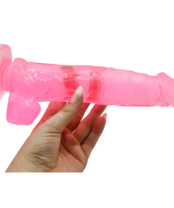 This thick jelly dildo has a generous length and girth to fill you with deep-penetrating pleasure! This hand-crafted neon dong gives you a realistic feel with the hand-crafted penis and testicle details in a flirty pink color that is less intimidating than a realistic toy! The raised veins and sculpted penis tip massage your G-spot and build your arousal for an intense orgasm! A strong suction cup base lets mount this almost 2-inch thick toy to any flat surface so you enjoy a hands-free pounding or fulfill a threesome fantasy with your partner! You will love the soft. flexible feel of the jelly material and the ample girth of this veined cock as it bends to massage your G-spot in any position!